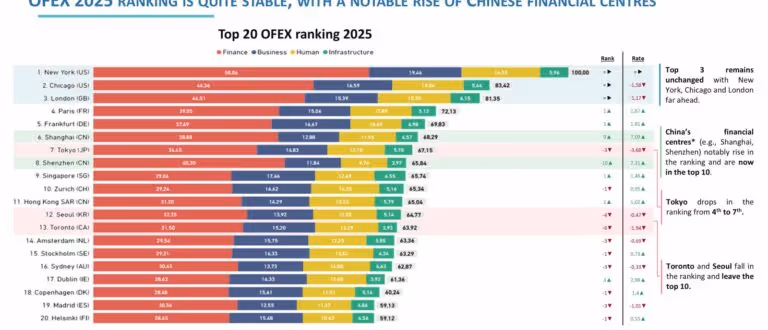 Among the highlights of this second edition, five new financial centers are joining the OFEX ranking due to better data availability: Abu Dhabi (United Arab Emirates), Athens (Greece), Bogota (Colombia), Bogota (Colombia), Manama (Colombia), Manama (Colombia), Manama (Bahrain), and Vilnius (Lithuania). Moreover, while the top three remains unchanged with New York, Chicago and London, developments have taken place in the rest of the top 10 with the decline of Tokyo, the rise of Paris and Frankfurt, as well as the entry of two Chinese financial centers: Shanghai and Shenzhen, as well as the entry of two Chinese financial centers: Shanghai and Shenzhen. The rest of the exclusive ranking is available at the following address: